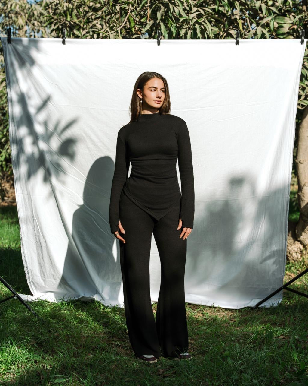 Clean lines, a sculpted asymmetric top, and relaxed wide-leg pants come together to create a silhouette that’s modern, minimal, and effortlessly elevated.